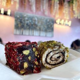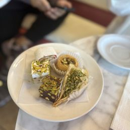 Damask was on our radar after a big lunch, this was just the place for a quaint dessert spot w/ friends and delicious pastries. I wish I remembered all the names of the delicious Syrian desserts we ordered...my most favorite was the biscuit filled w/ dates. It was so buttery and perfect. We loved their Turkish Delights and baklavas and birds nest. All of it were so delectable and satisfying. Service at the counter was very friendly and staff was extremely patient explain their menu. We can't wait to go back and try more scrumptious items!